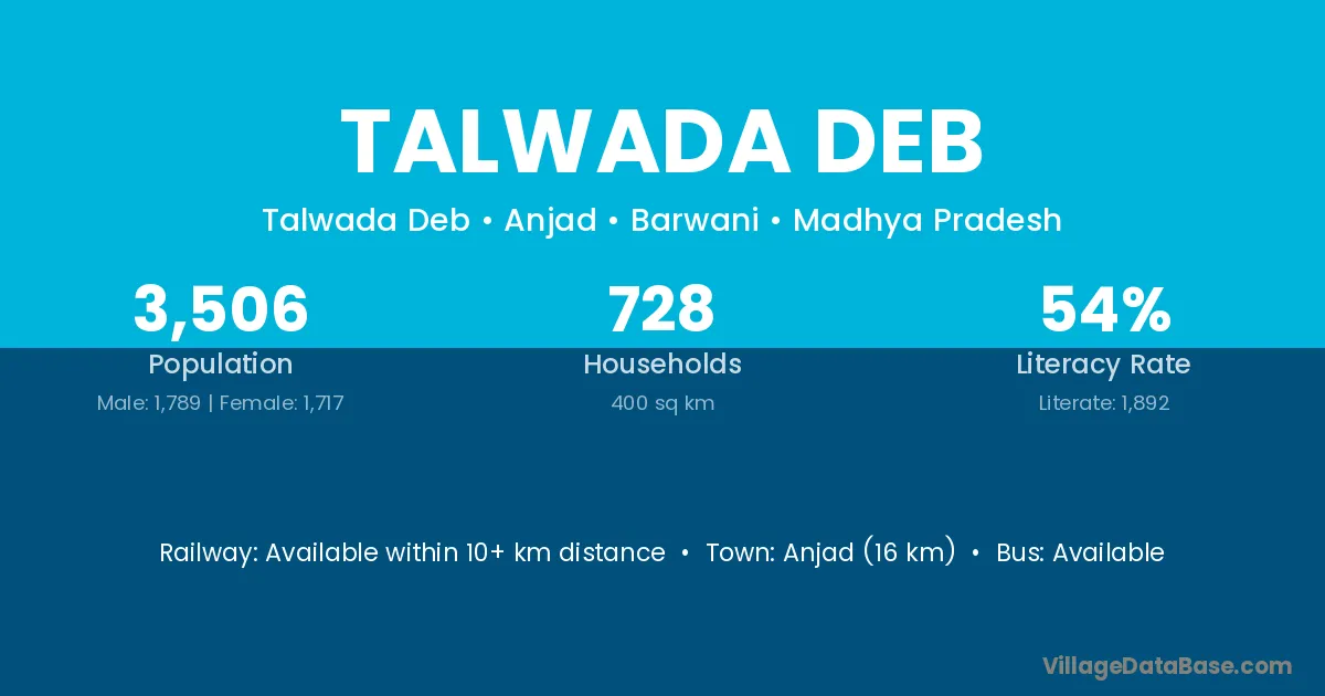 Anjad (16 km) is the nearest town to Talwada Deb village for major economic activities and is located approximately 16 km away.