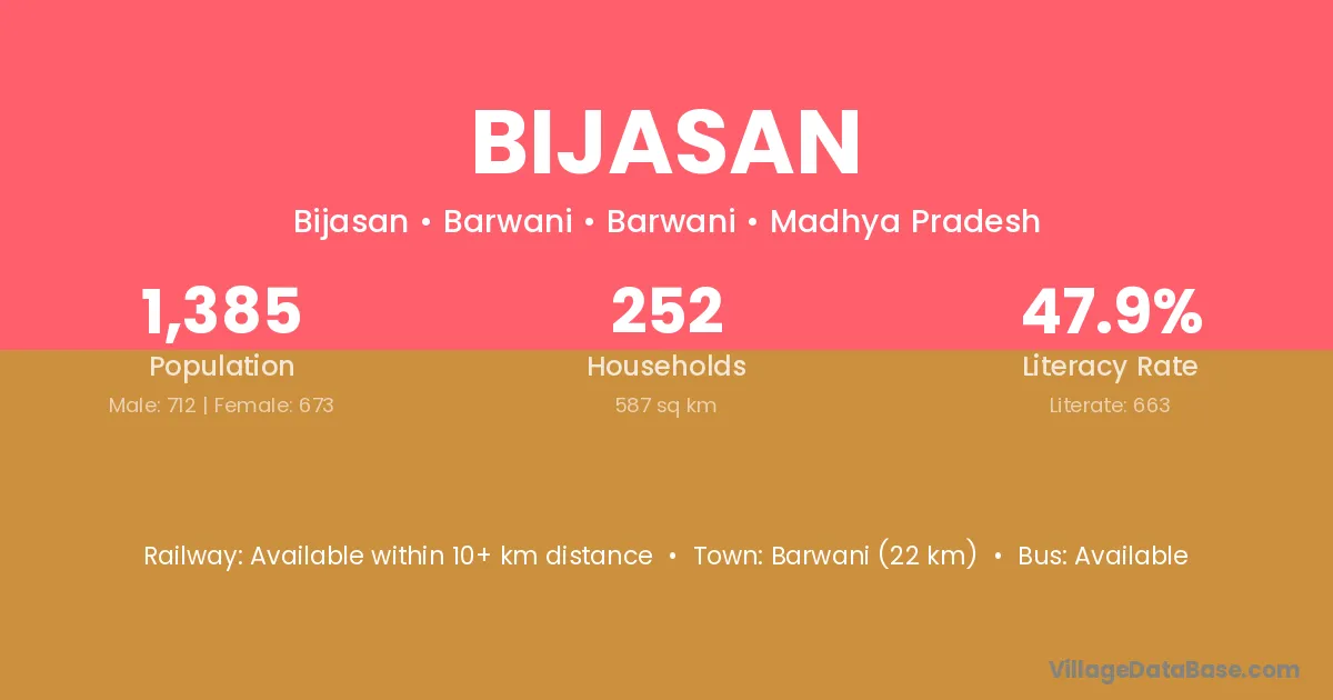 Barwani (22 km) is the nearest town to Bijasan village for major economic activities and is located approximately 22 km away.