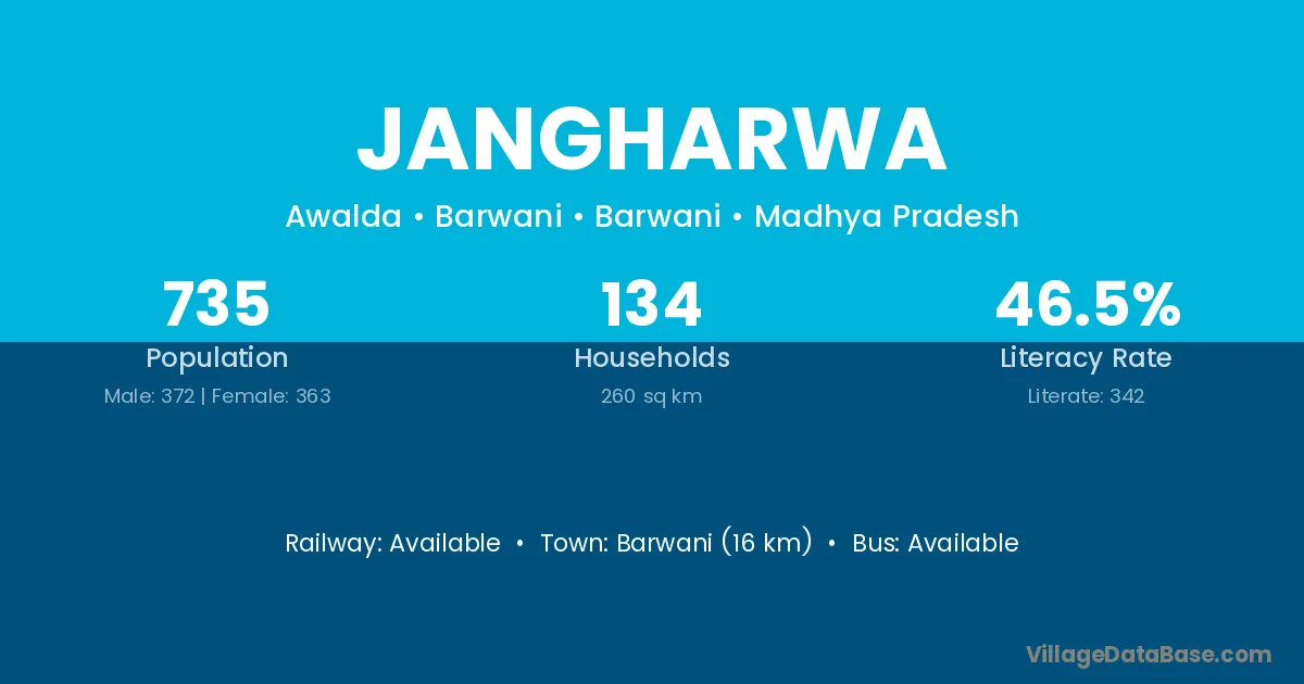 Barwani (16 km) is the nearest town to Jangharwa village for major economic activities and is located approximately 16 km away.