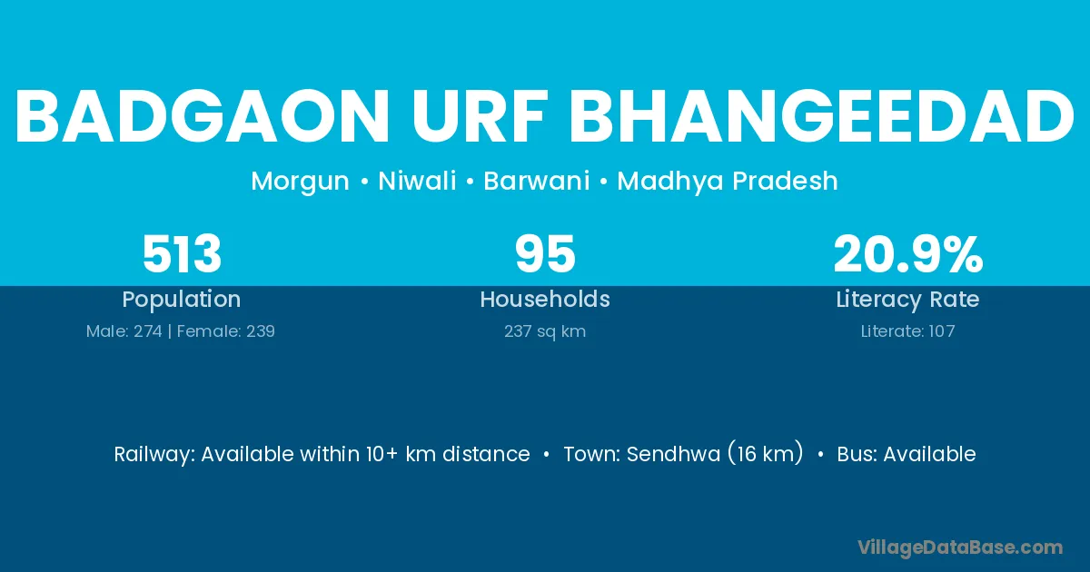 Sendhwa (16 km) is the nearest town to Badgaon Urf Bhangeedad village for major economic activities and is located approximately 16 km away.