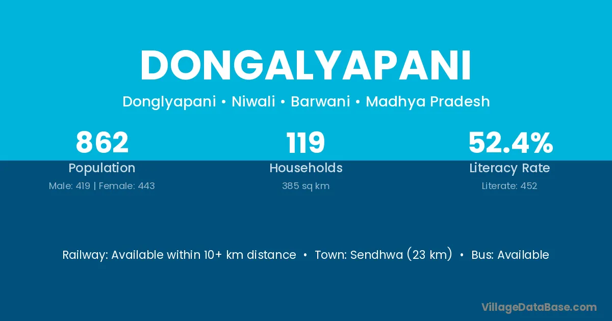 Sendhwa (23 km) is the nearest town to Dongalyapani village for major economic activities and is located approximately 23 km away.
