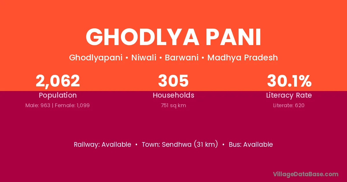 Sendhwa (31 km) is the nearest town to Ghodlya Pani village for major economic activities and is located approximately 31 km away.