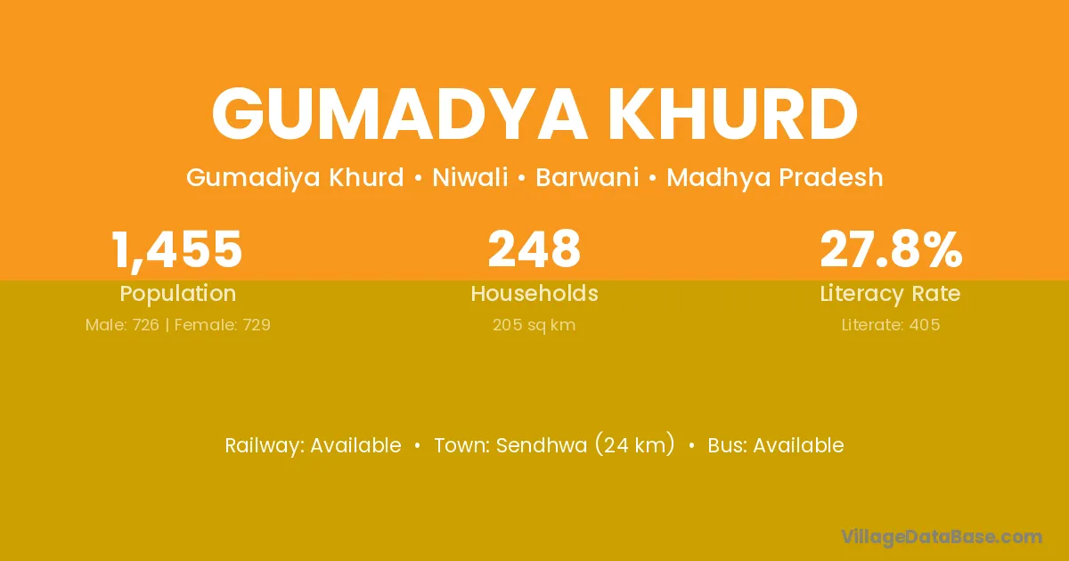 Sendhwa (24 km) is the nearest town to Gumadya Khurd village for major economic activities and is located approximately 24 km away.