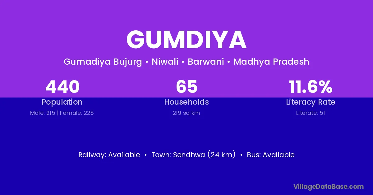 Sendhwa (24 km) is the nearest town to Gumdiya village for major economic activities and is located approximately 24 km away.