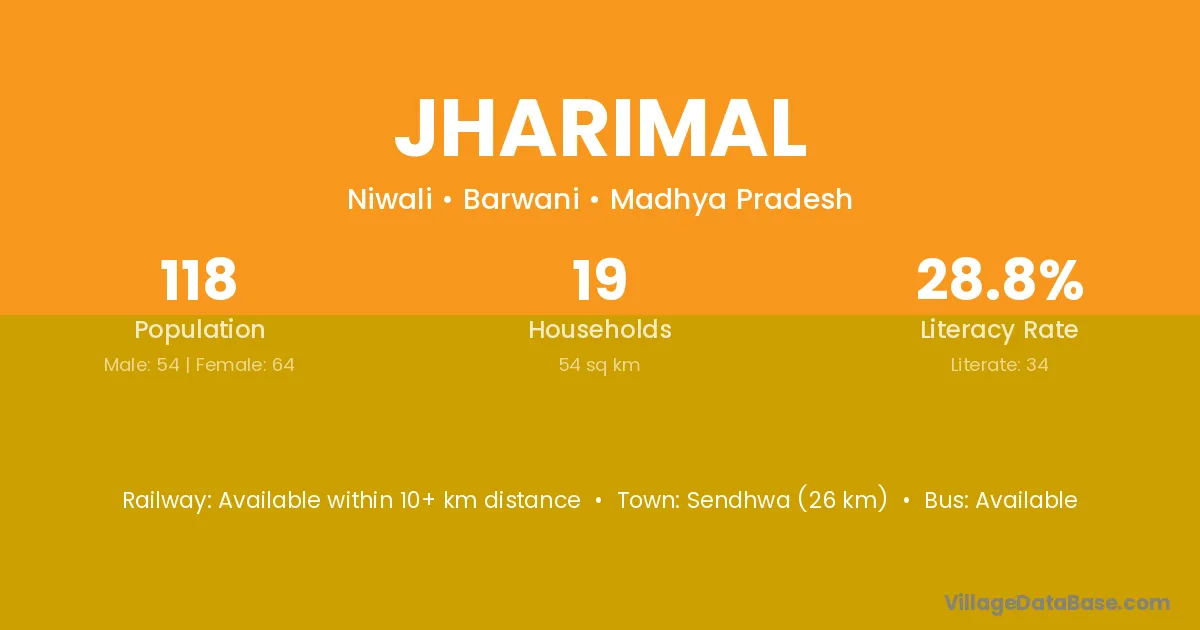 Sendhwa (26 km) is the nearest town to Jharimal village for major economic activities and is located approximately 26 km away.