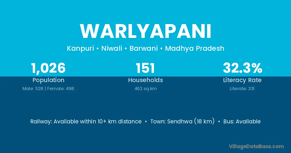 Sendhwa (18 km) is the nearest town to Warlyapani village for major economic activities and is located approximately 18 km away.