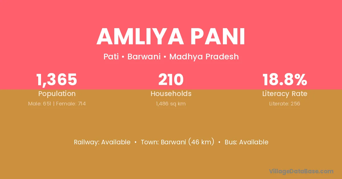 The literacy rate of Amliya Pani village is 31.52%. Male literacy stands at 32.88% and female literacy at 30.43%.