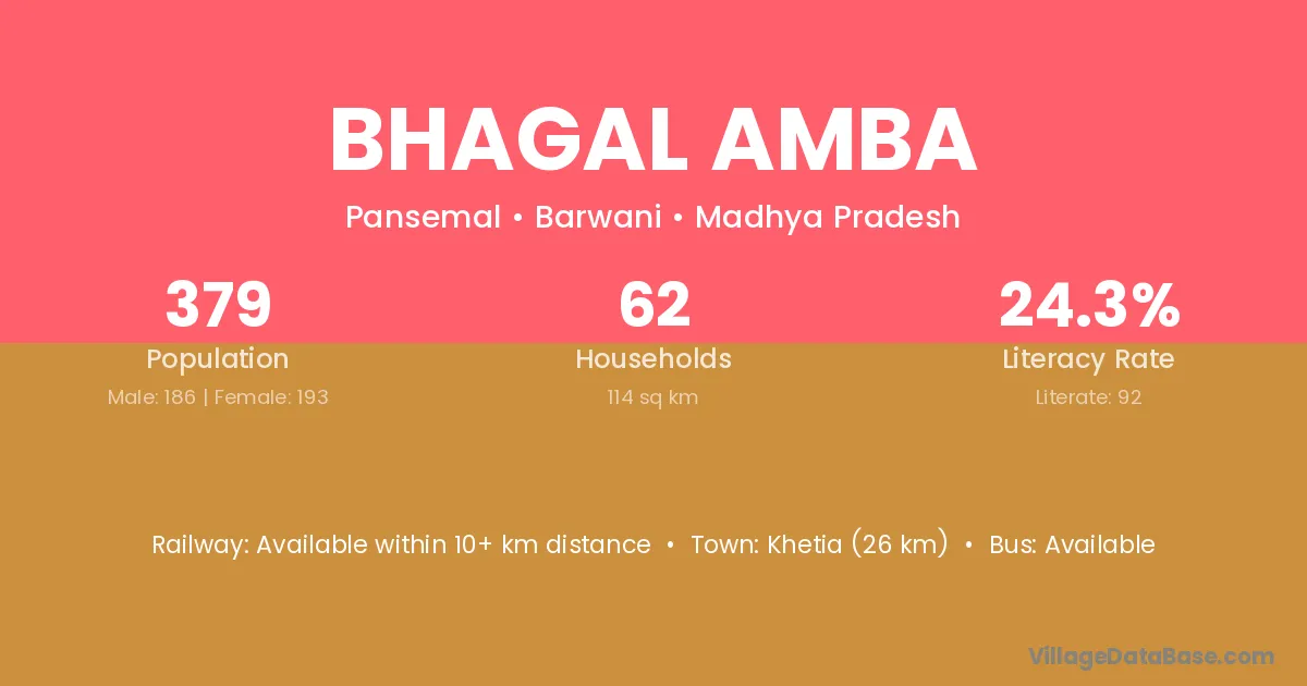 Bhagal Amba village has a total population of 379 people, of which 186 are males and 193 are females.