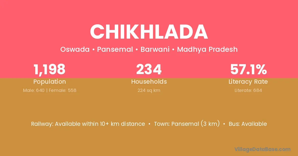 Chikhlada village has a total population of 1,198 people, of which 640 are males and 558 are females.