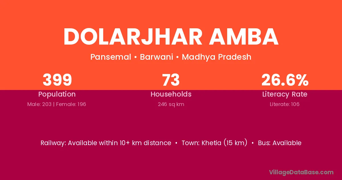 Khetia (15 km) is the nearest town to Dolarjhar Amba village for major economic activities and is located approximately 15 km away.