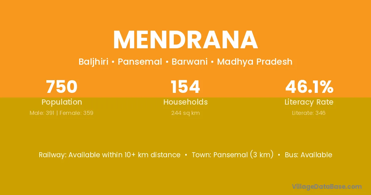 Mendrana village has a total population of 750 people, of which 391 are males and 359 are females.
