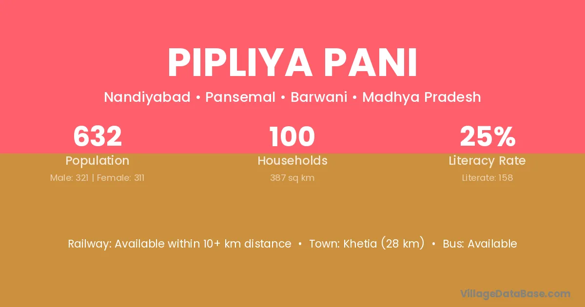 Pipliya Pani village has a total population of 632 people, of which 321 are males and 311 are females.