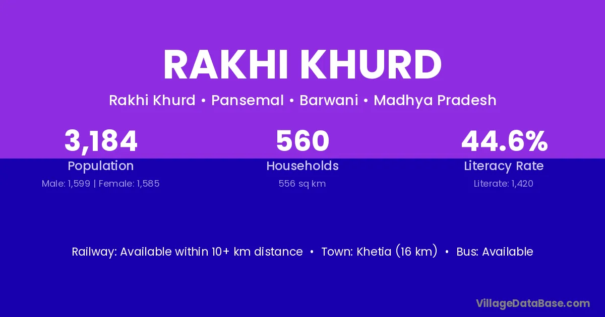 Khetia (16 km) is the nearest town to Rakhi Khurd village for major economic activities and is located approximately 16 km away.