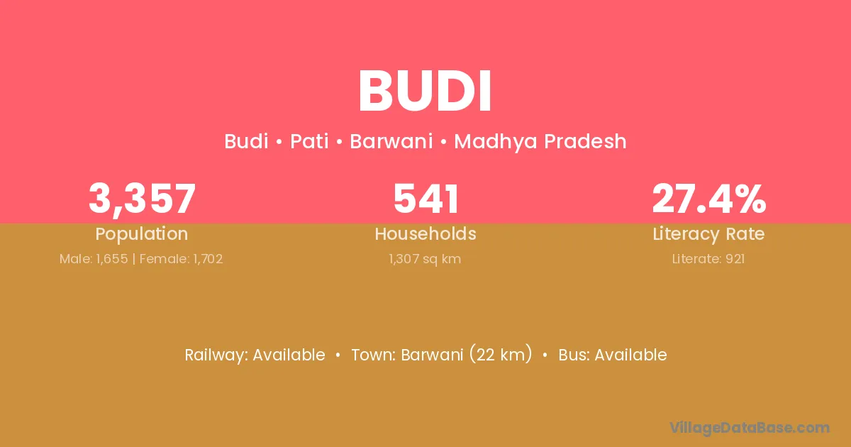 Barwani (22 km) is the nearest town to Budi village for major economic activities and is located approximately 22 km away.
