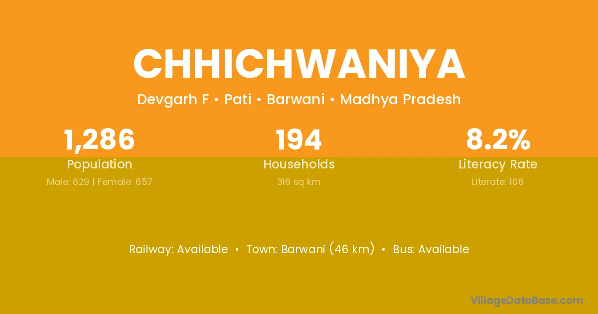Barwani (46 km) is the nearest town to Chhichwaniya village for major economic activities and is located approximately 46 km away.
