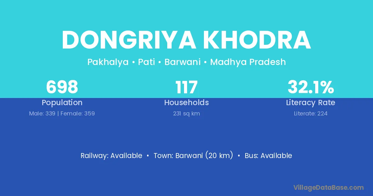 Barwani (20 km) is the nearest town to Dongriya Khodra village for major economic activities and is located approximately 20 km away.