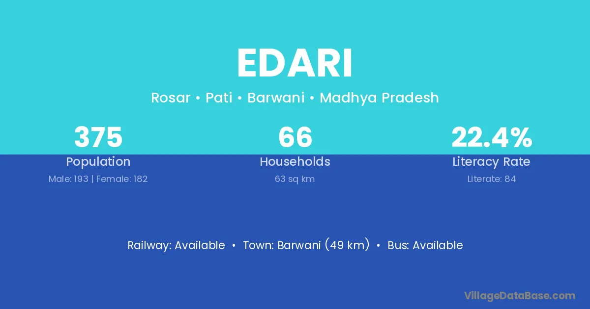 Barwani (49 km) is the nearest town to Edari village for major economic activities and is located approximately 49 km away.