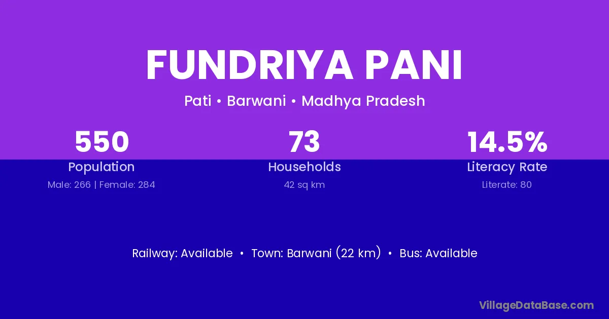 Barwani (22 km) is the nearest town to Fundriya Pani village for major economic activities and is located approximately 22 km away.