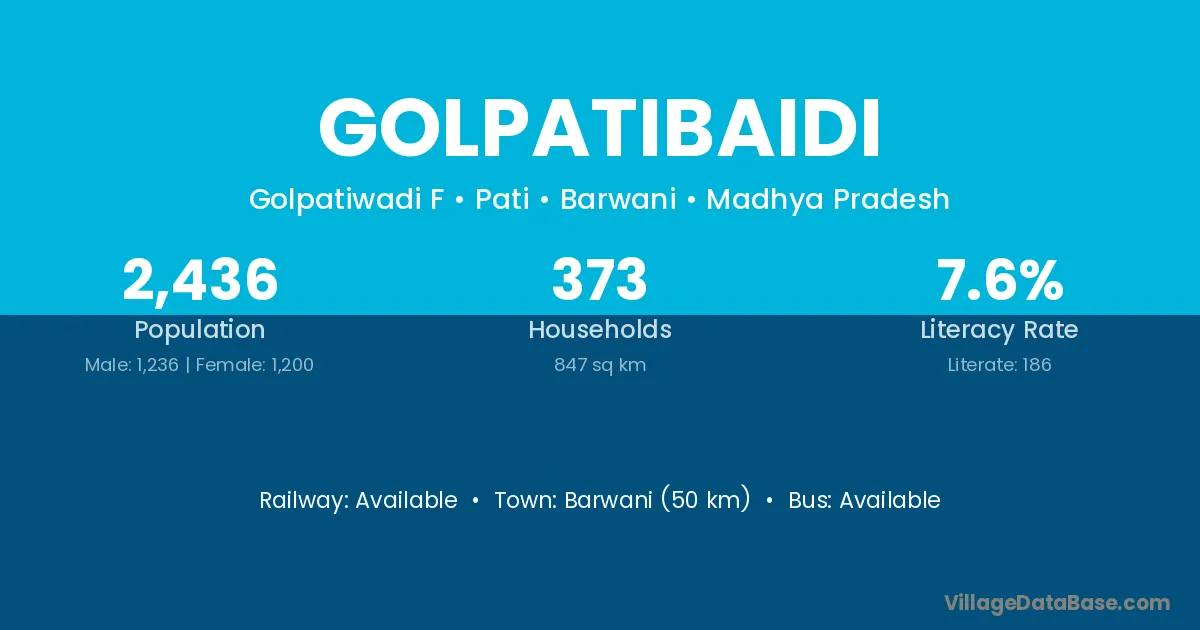 Barwani (50 km) is the nearest town to Golpatibaidi village for major economic activities and is located approximately 50 km away.