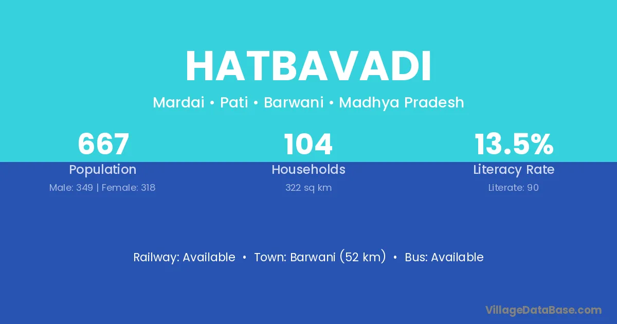 Barwani (52 km) is the nearest town to Hatbavadi village for major economic activities and is located approximately 52 km away.