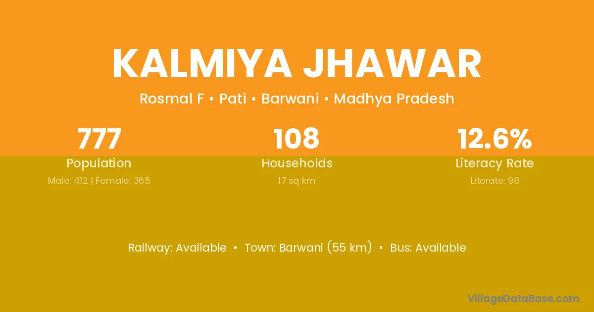 Barwani (55 km) is the nearest town to Kalmiya Jhawar village for major economic activities and is located approximately 55 km away.