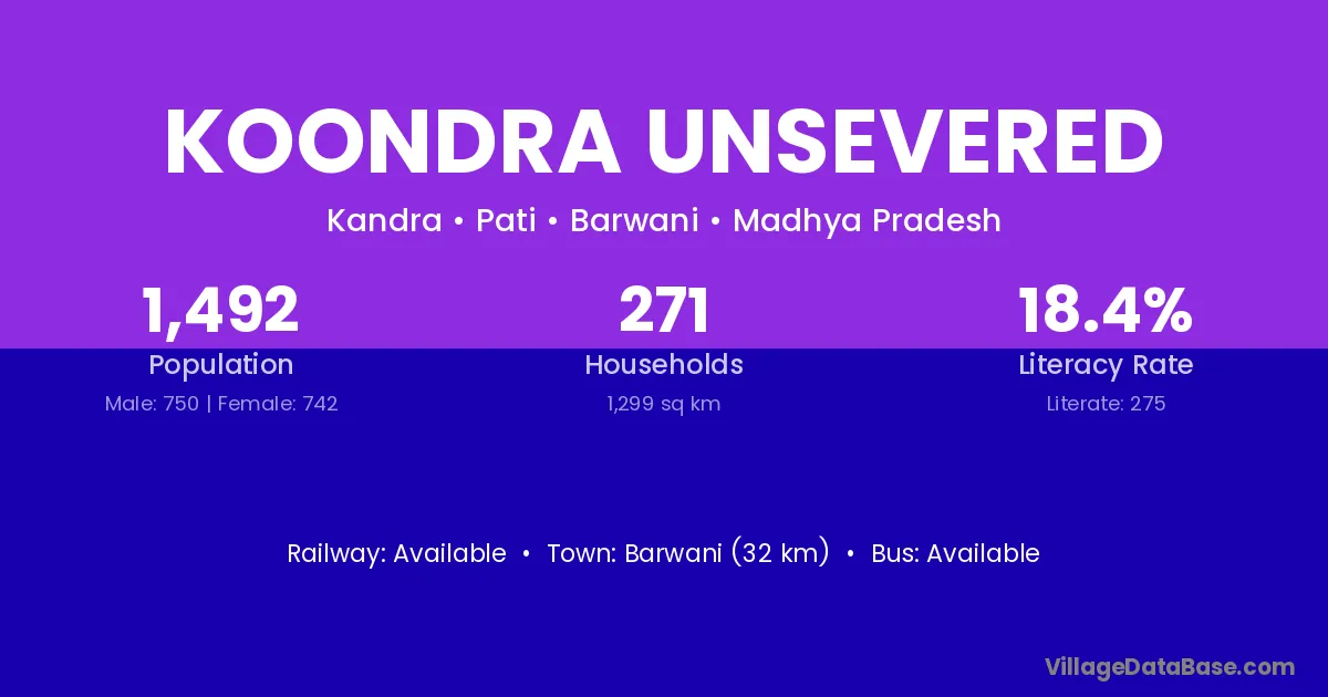 Barwani (32 km) is the nearest town to Koondra Unsevered village for major economic activities and is located approximately 32 km away.