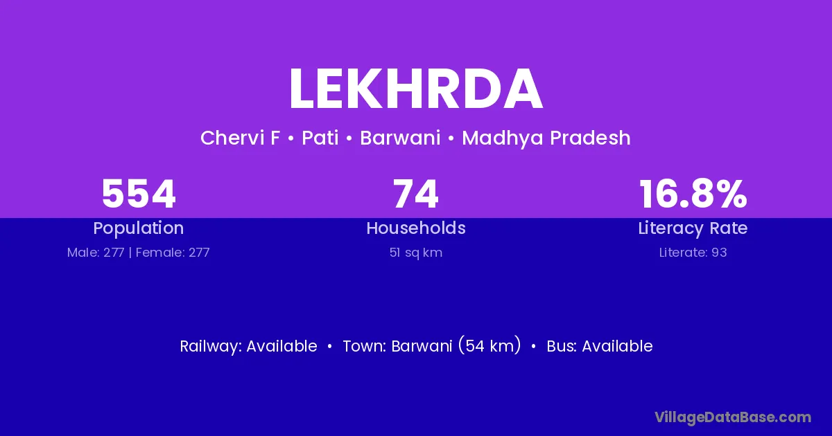Barwani (54 km) is the nearest town to Lekhrda village for major economic activities and is located approximately 54 km away.