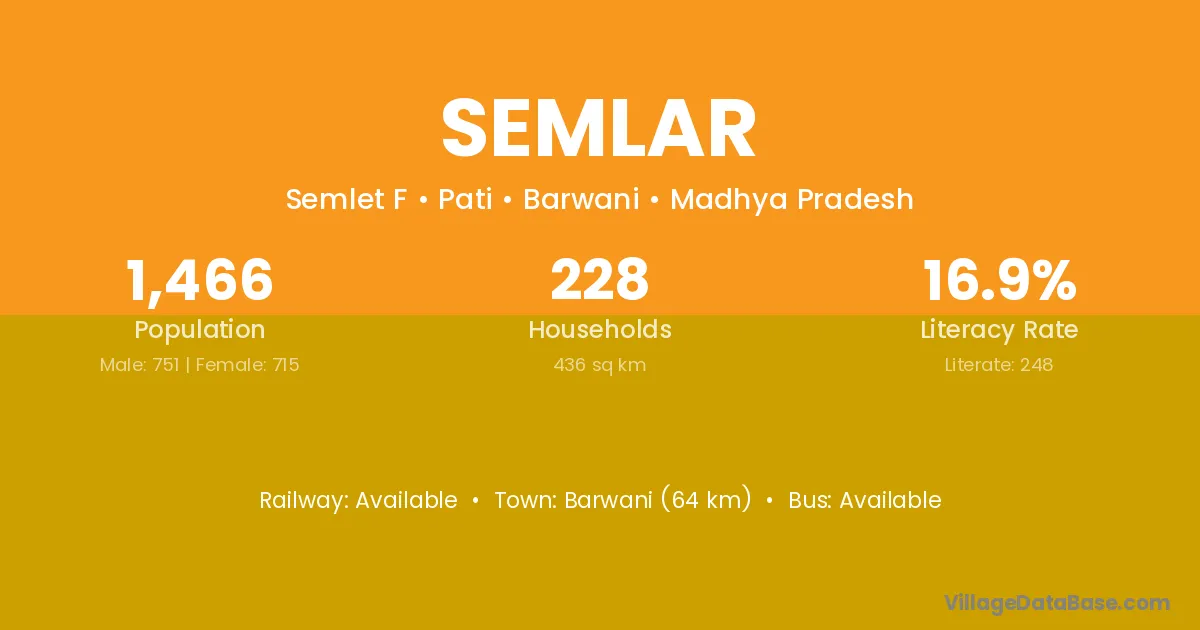 Barwani (64 km) is the nearest town to Semlar village for major economic activities and is located approximately 64 km away.