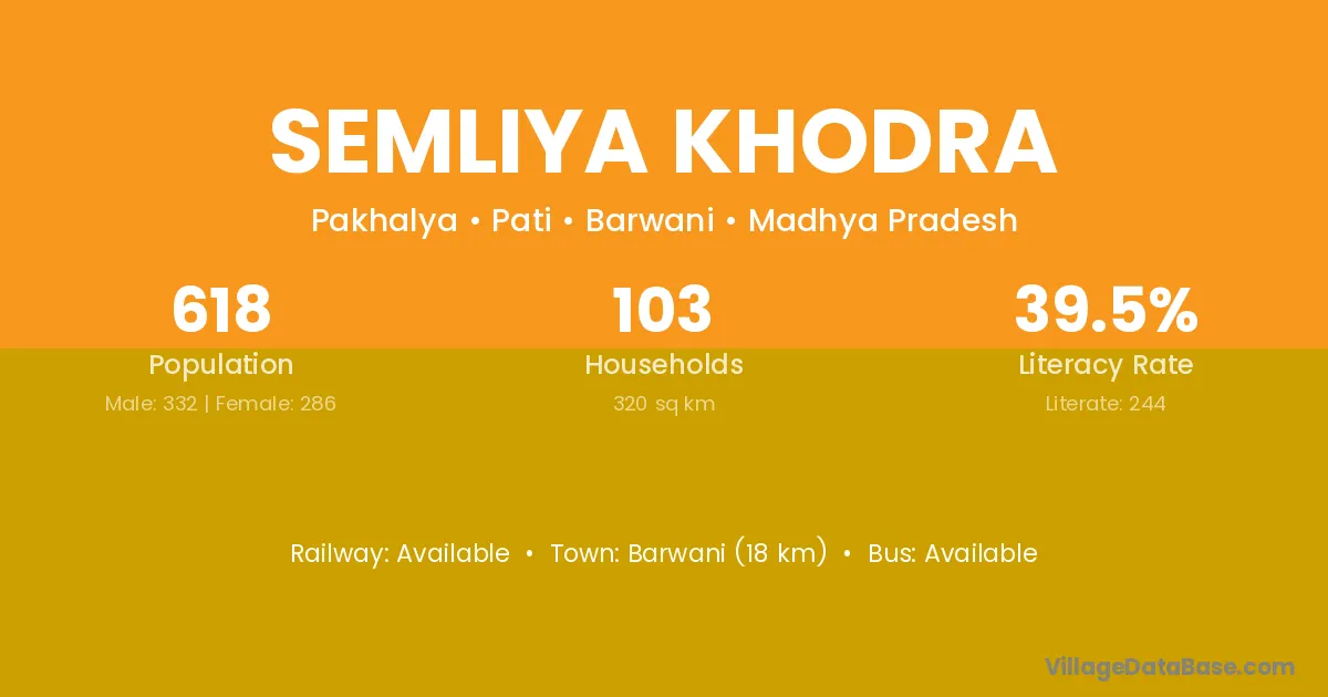 Barwani (18 km) is the nearest town to Semliya Khodra village for major economic activities and is located approximately 18 km away.