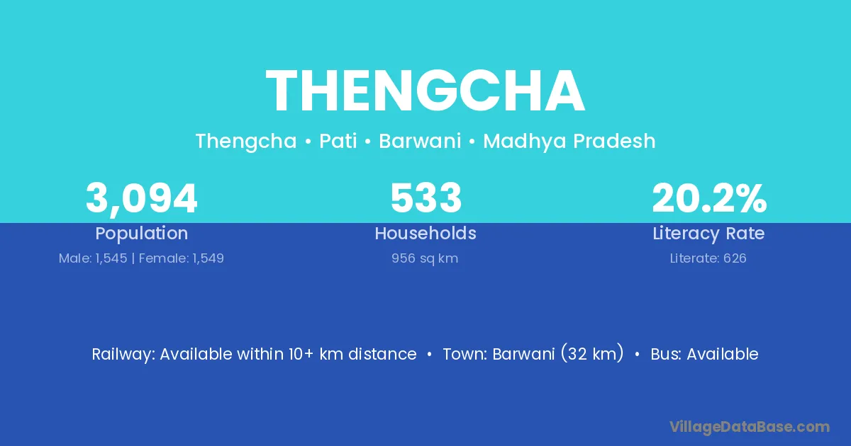 Barwani (32 km) is the nearest town to Thengcha village for major economic activities and is located approximately 32 km away.