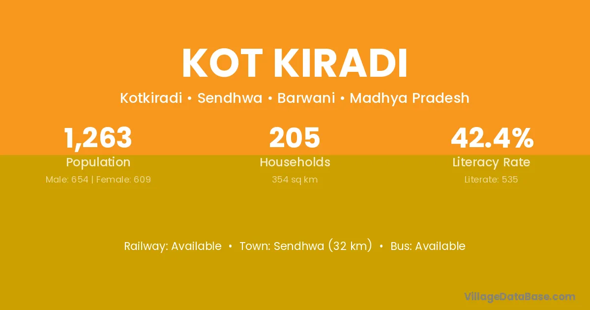 Sendhwa (32 km) is the nearest town to Kot Kiradi village for major economic activities and is located approximately 32 km away.
