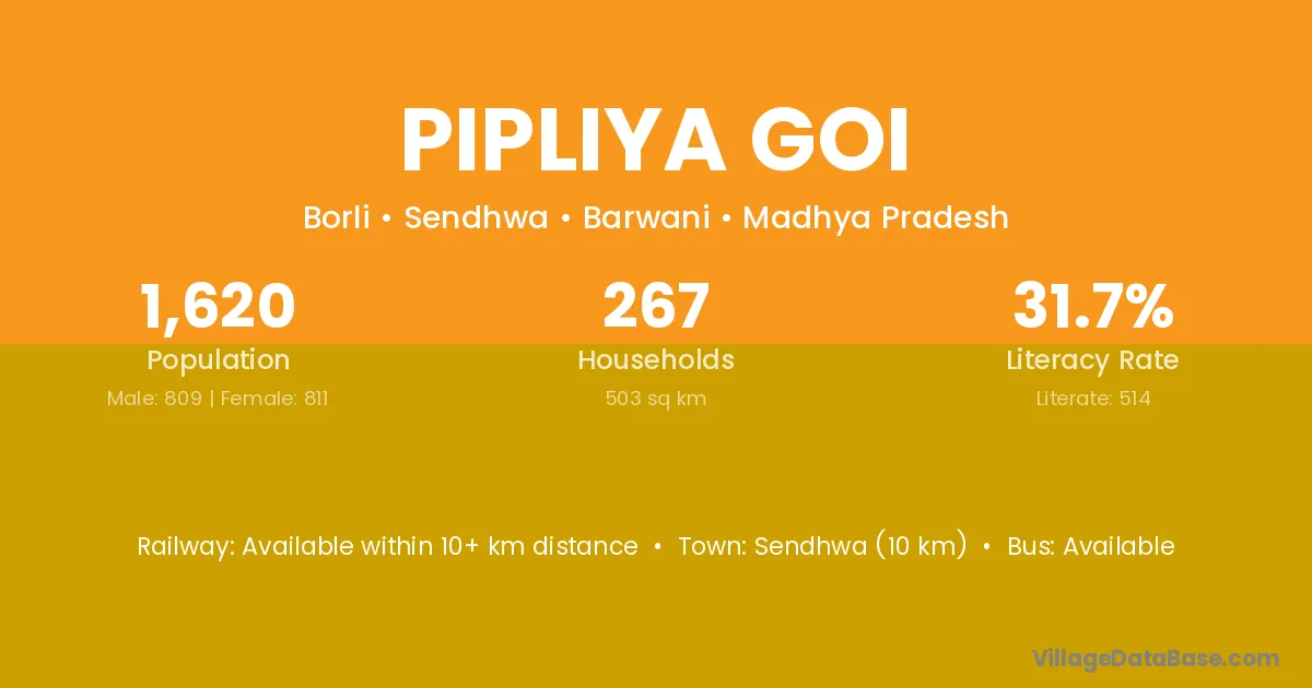 Sendhwa (10 km) is the nearest town to Pipliya Goi village for major economic activities and is located approximately 10 km away.