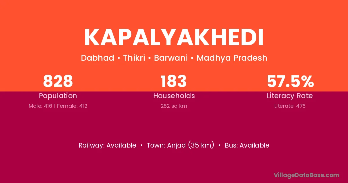 Kapalyakhedi village has a total population of 828 people, of which 416 are males and 412 are females.