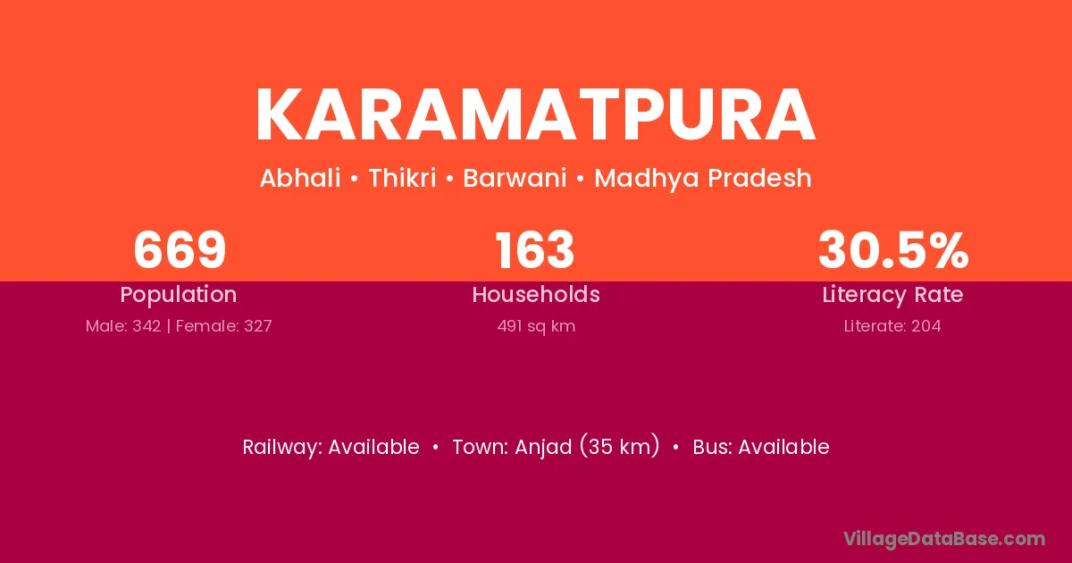 Anjad (35 km) is the nearest town to Karamatpura village for major economic activities and is located approximately 35 km away.