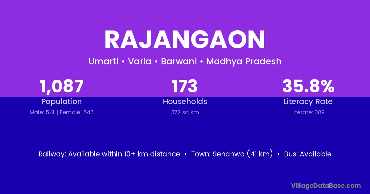 Sendhwa (41 km) is the nearest town to Rajangaon village for major economic activities and is located approximately 41 km away.