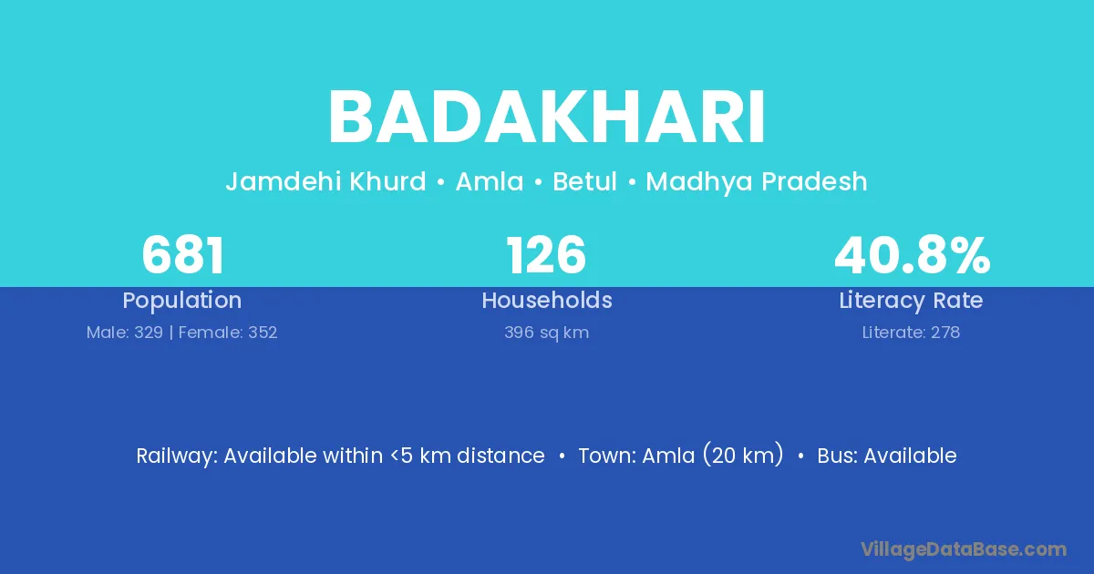 Amla (20 km) is the nearest town to Badakhari village for major economic activities and is located approximately 20 km away.