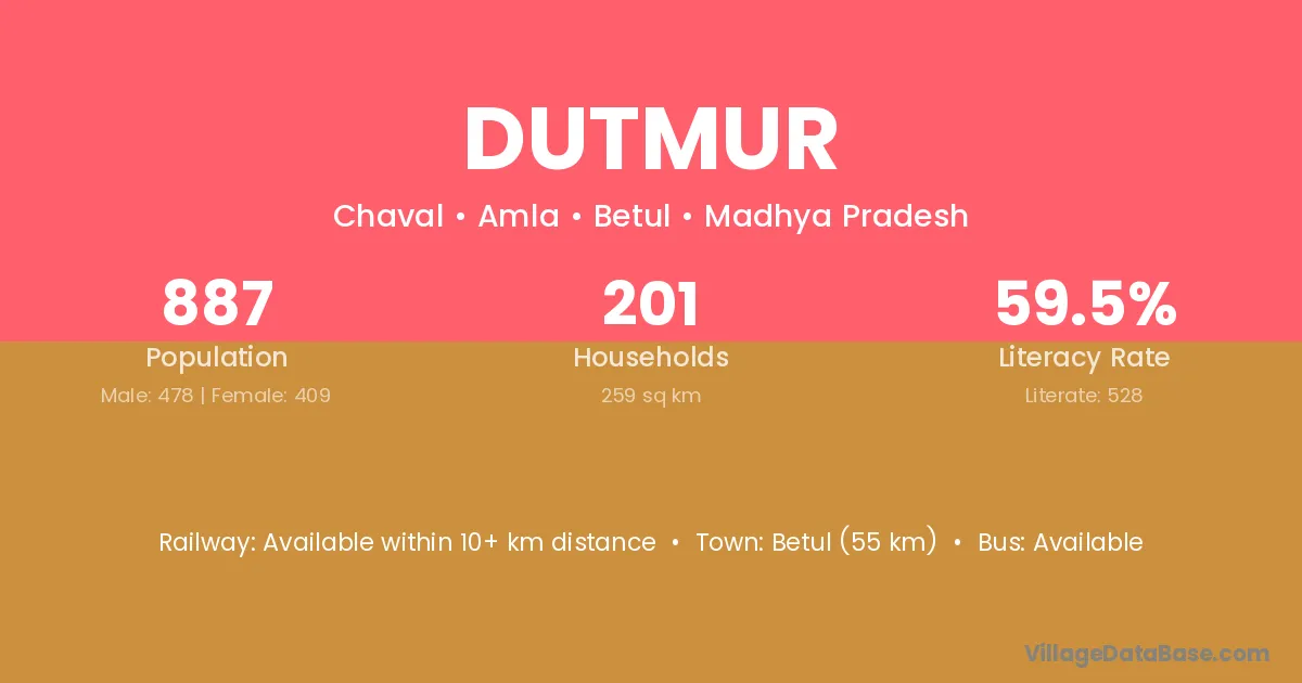 Betul (55 km) is the nearest town to Dutmur village for major economic activities and is located approximately 55 km away.