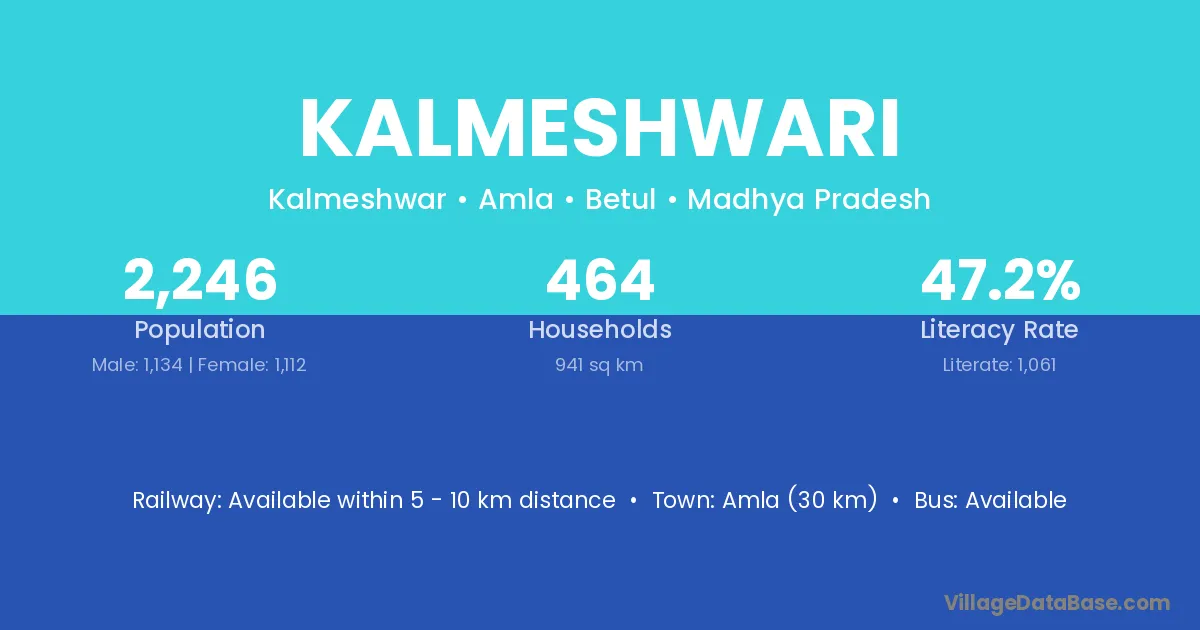 Amla (30 km) is the nearest town to Kalmeshwari village for major economic activities and is located approximately 30 km away.