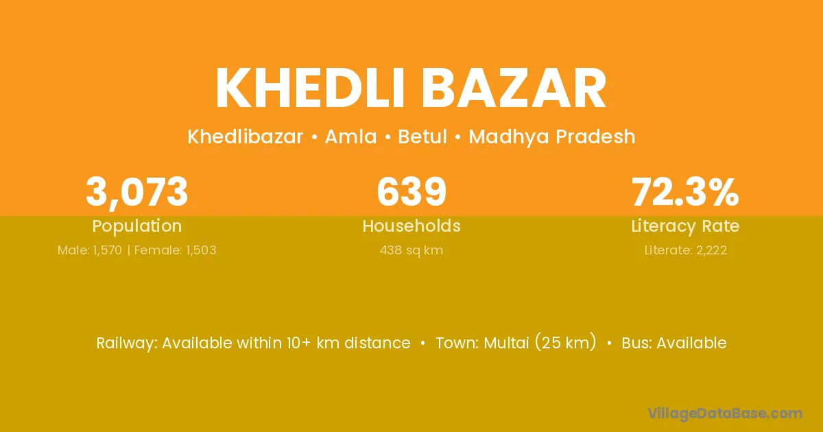 Multai (25 km) is the nearest town to Khedli Bazar village for major economic activities and is located approximately 25 km away.