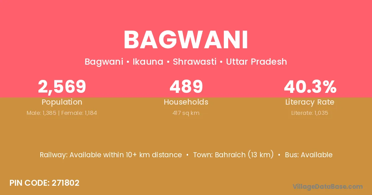 The literacy rate of Bagwani village is 42.26%. Male literacy stands at 53.04% and female literacy at 31.27%.