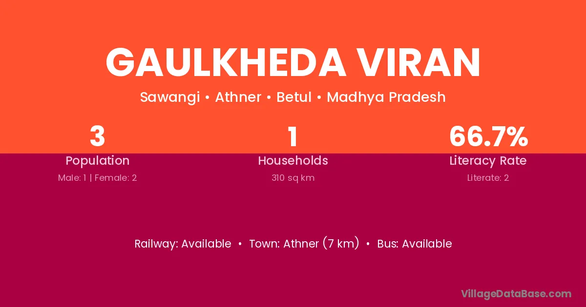 Gaulkheda Viran village has a total population of 3 people, of which 1 are males and 2 are females.