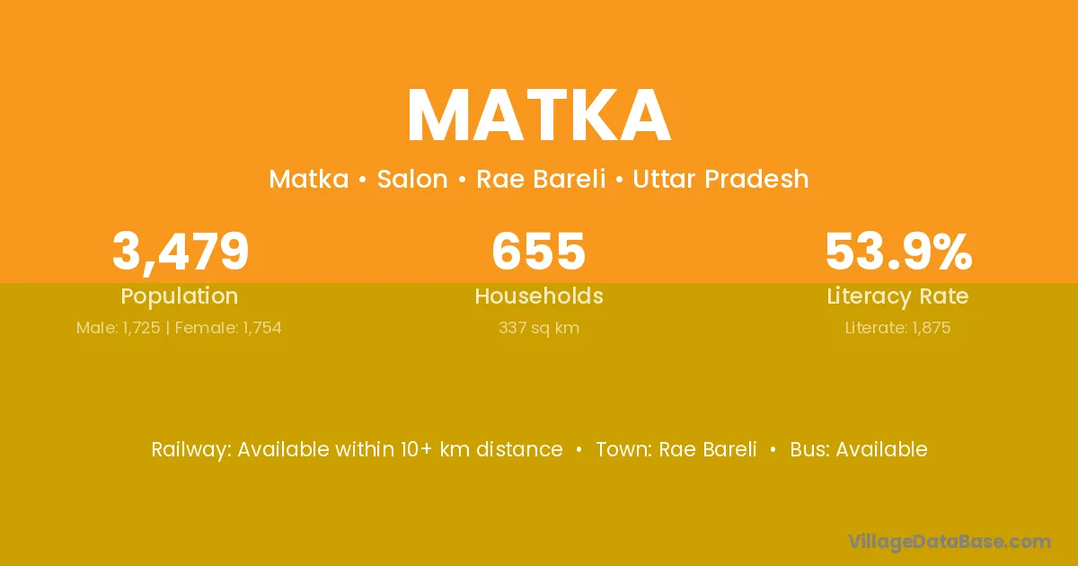 The literacy rate of Matka village is 58.06%. Male literacy stands at 68.19% and female literacy at 48.16%.