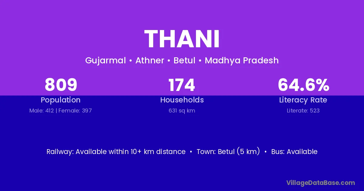 Betul (5 km) is the nearest town to Thani village for major economic activities and is located approximately 5 km away.