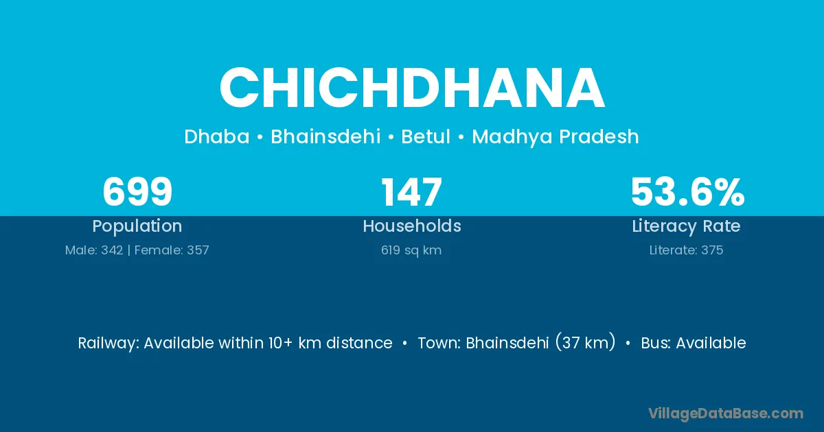 Bhainsdehi (37 km) is the nearest town to Chichdhana village for major economic activities and is located approximately 37 km away.