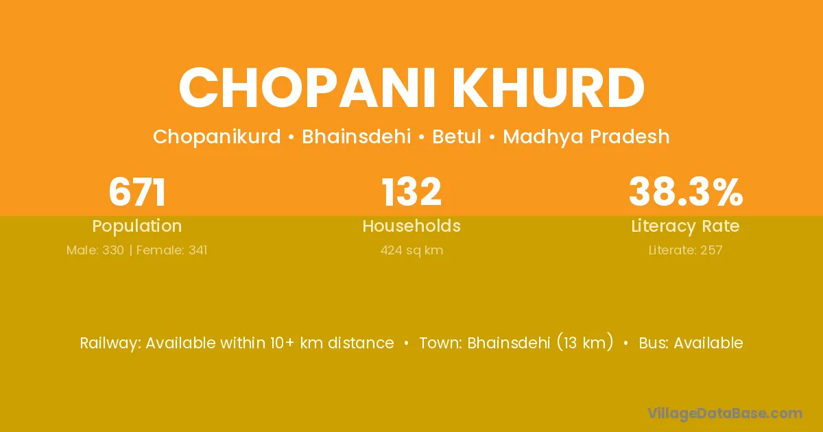 Bhainsdehi (13 km) is the nearest town to Chopani Khurd village for major economic activities and is located approximately 13 km away.