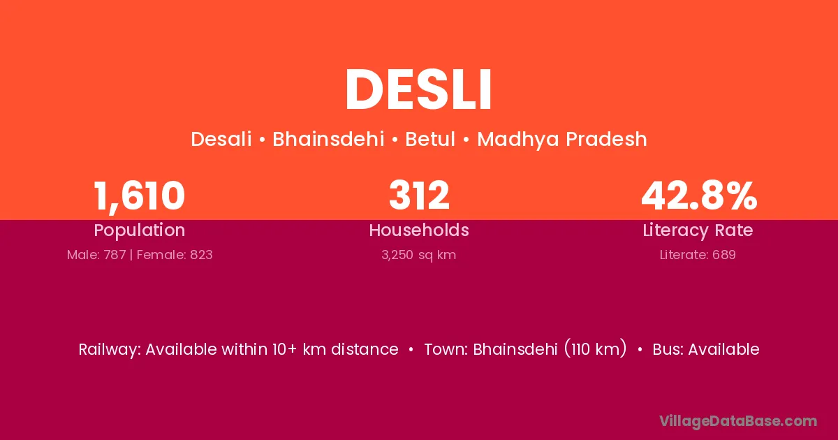 Bhainsdehi (110 km) is the nearest town to Desli village for major economic activities and is located approximately 110 km away.