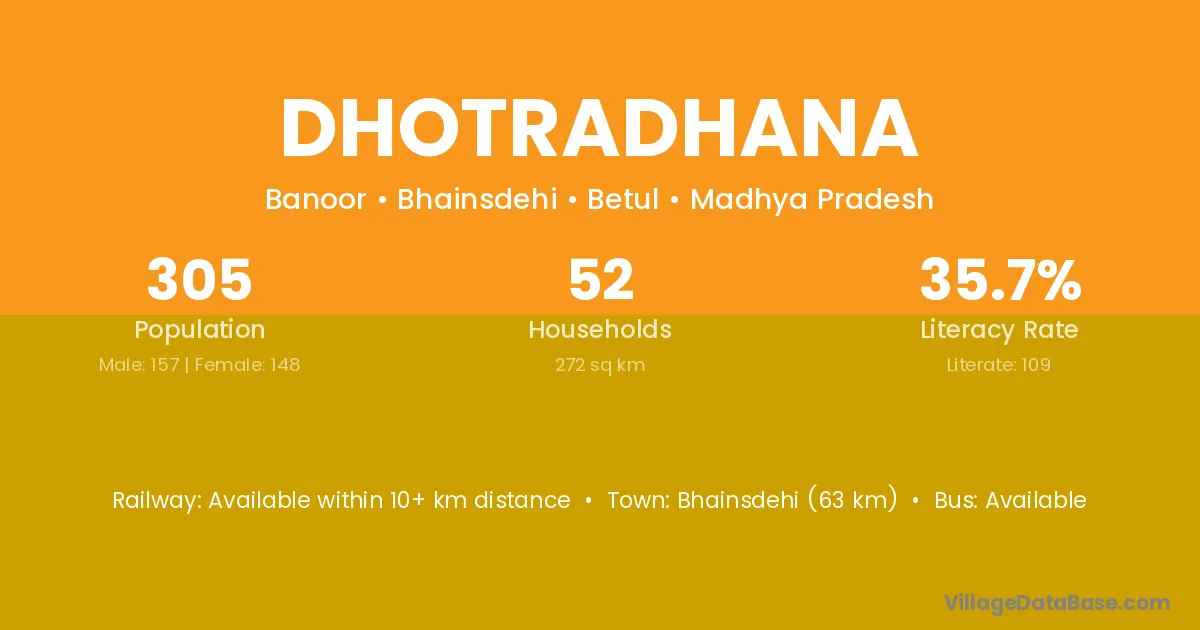 Bhainsdehi (63 km) is the nearest town to Dhotradhana village for major economic activities and is located approximately 63 km away.