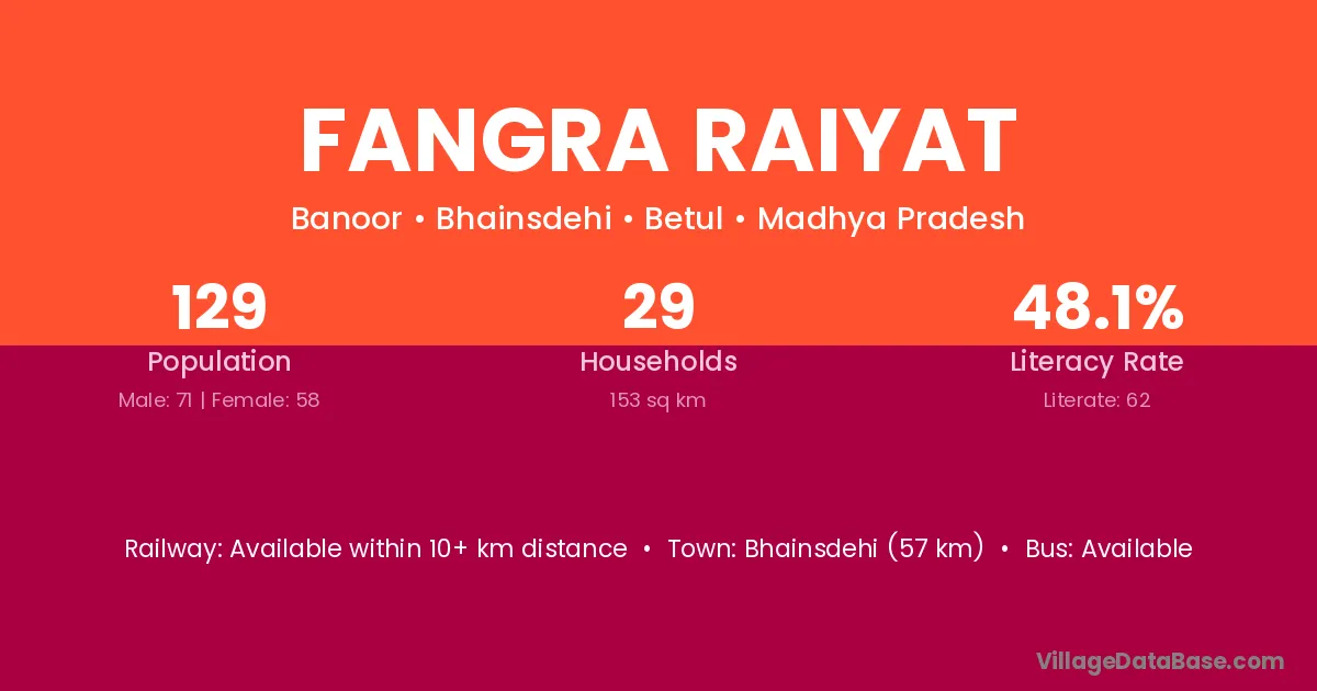 Bhainsdehi (57 km) is the nearest town to Fangra Raiyat village for major economic activities and is located approximately 57 km away.