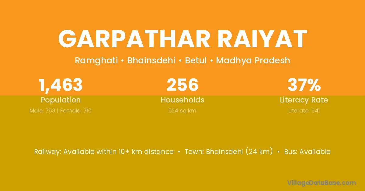Bhainsdehi (24 km) is the nearest town to Garpathar Raiyat village for major economic activities and is located approximately 24 km away.