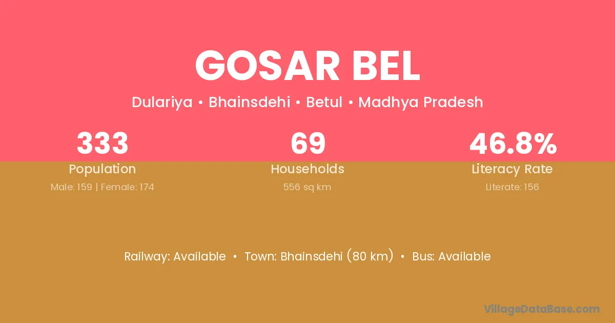 Bhainsdehi (80 km) is the nearest town to Gosar Bel village for major economic activities and is located approximately 80 km away.
